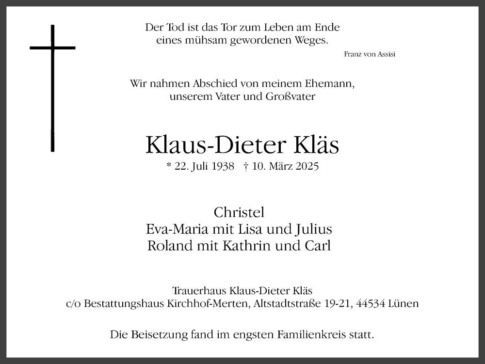 Hier finden Sie alle Traueranzeigen aus der Zeitung, die bisher für Klaus-Dieter Kläs erschienen sind. Weitere Traueranzeigen, die in der Zeitung erscheinen, werden hier ebenfalls aufgelistet