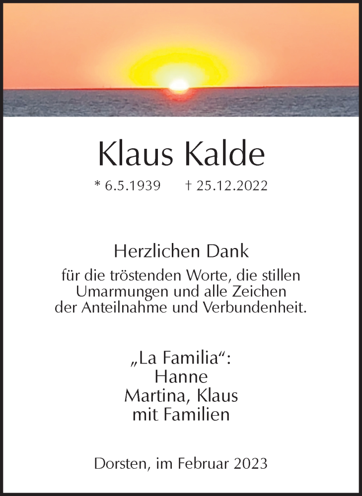 Hier finden Sie alle Traueranzeigen aus der Zeitung, die bisher für Klaus Kalde erschienen sind. Weitere Traueranzeigen, die in der Zeitung erscheinen, werden hier ebenfalls aufgelistet