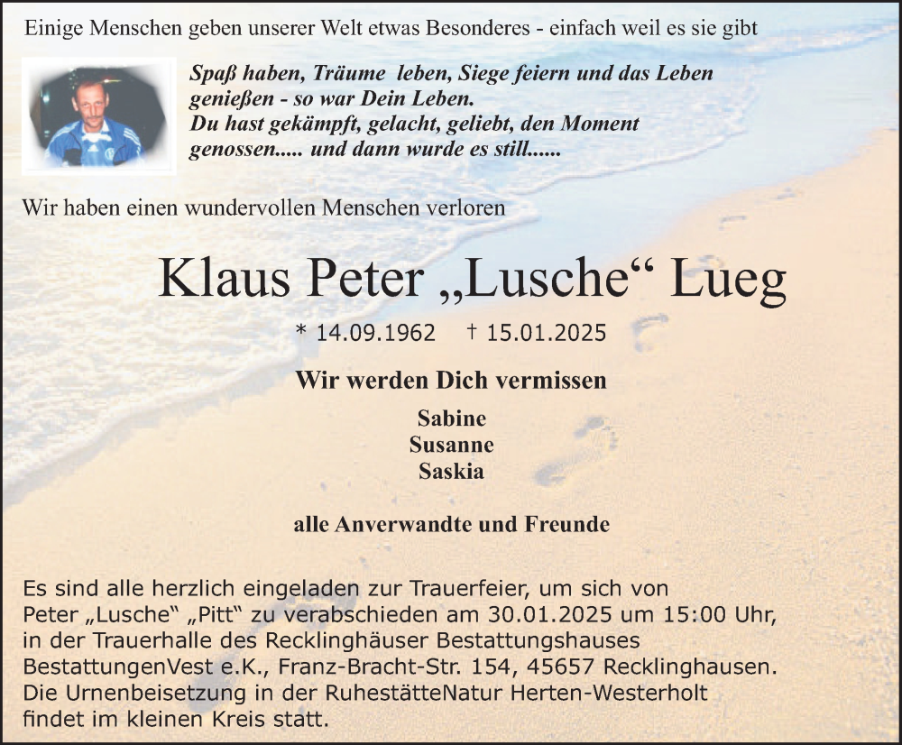 Hier finden Sie alle Traueranzeigen aus der Zeitung, die bisher für Klaus Peter Lueg erschienen sind. Weitere Traueranzeigen, die in der Zeitung erscheinen, werden hier ebenfalls aufgelistet