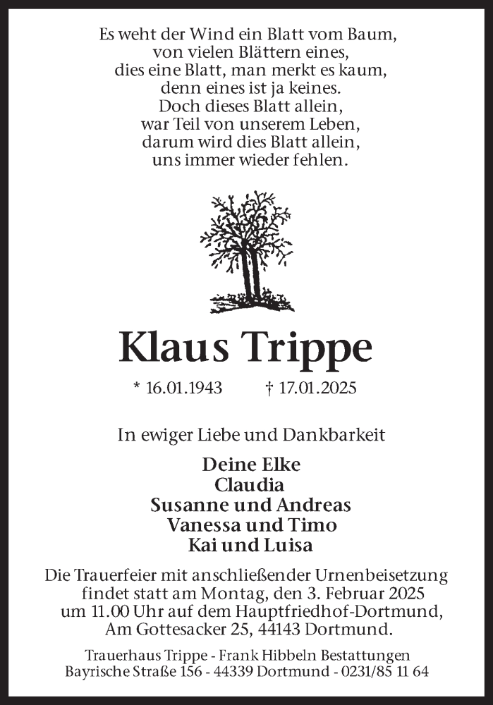 Hier finden Sie alle Traueranzeigen aus der Zeitung, die bisher für Klaus Trippe erschienen sind. Weitere Traueranzeigen, die in der Zeitung erscheinen, werden hier ebenfalls aufgelistet