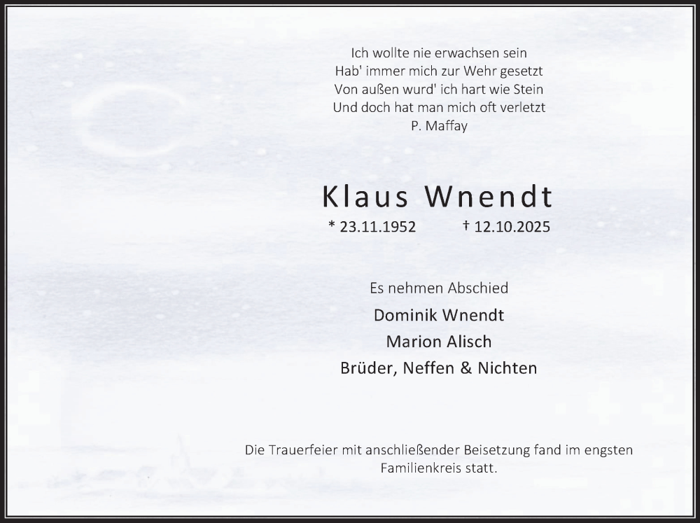 Hier finden Sie alle Traueranzeigen aus der Zeitung, die bisher für Klaus Wnendt erschienen sind. Weitere Traueranzeigen, die in der Zeitung erscheinen, werden hier ebenfalls aufgelistet