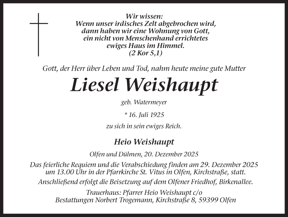 Hier finden Sie alle Traueranzeigen aus der Zeitung, die bisher für Liesel Weishaupt erschienen sind. Weitere Traueranzeigen, die in der Zeitung erscheinen, werden hier ebenfalls aufgelistet