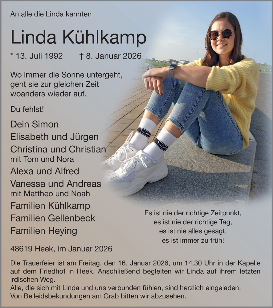 Hier finden Sie alle Traueranzeigen aus der Zeitung, die bisher für Linda Kühlkamp erschienen sind. Weitere Traueranzeigen, die in der Zeitung erscheinen, werden hier ebenfalls aufgelistet