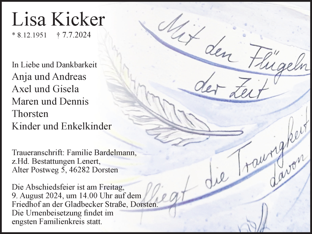Hier finden Sie alle Traueranzeigen aus der Zeitung, die bisher für Lisa Kicker erschienen sind. Weitere Traueranzeigen, die in der Zeitung erscheinen, werden hier ebenfalls aufgelistet
