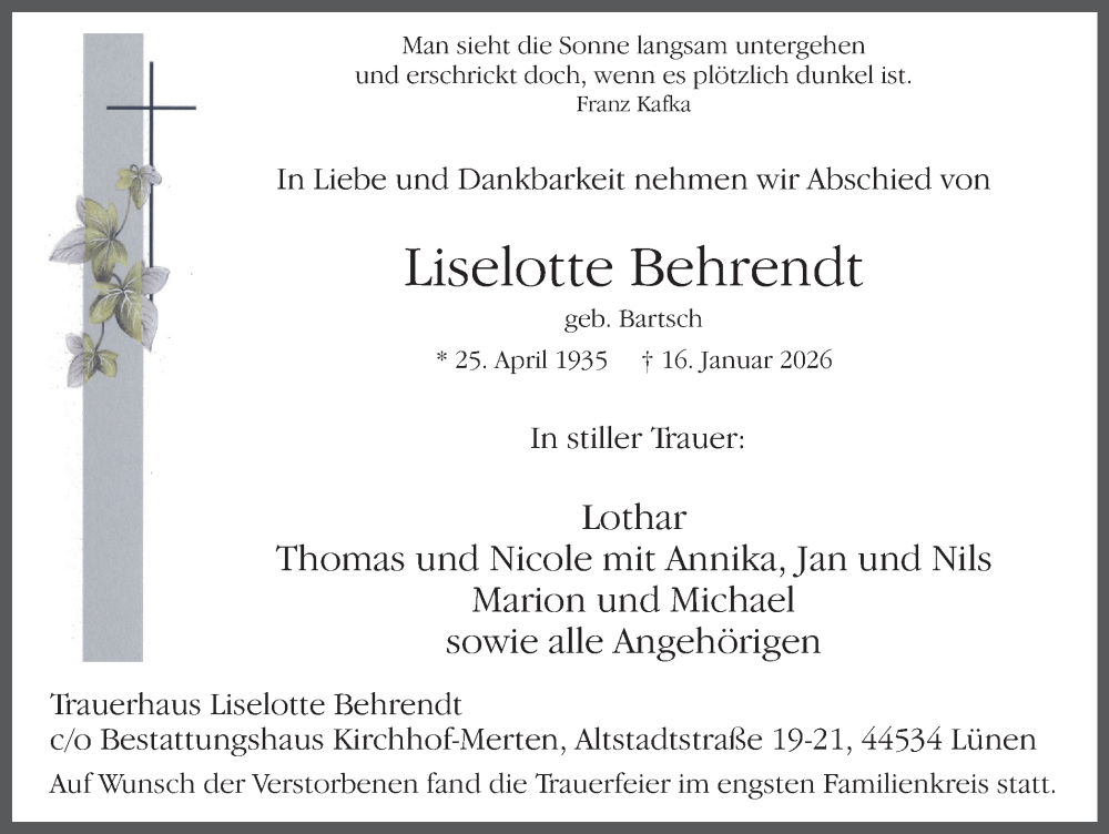 Hier finden Sie alle Traueranzeigen aus der Zeitung, die bisher für Liselotte Behrendt erschienen sind. Weitere Traueranzeigen, die in der Zeitung erscheinen, werden hier ebenfalls aufgelistet