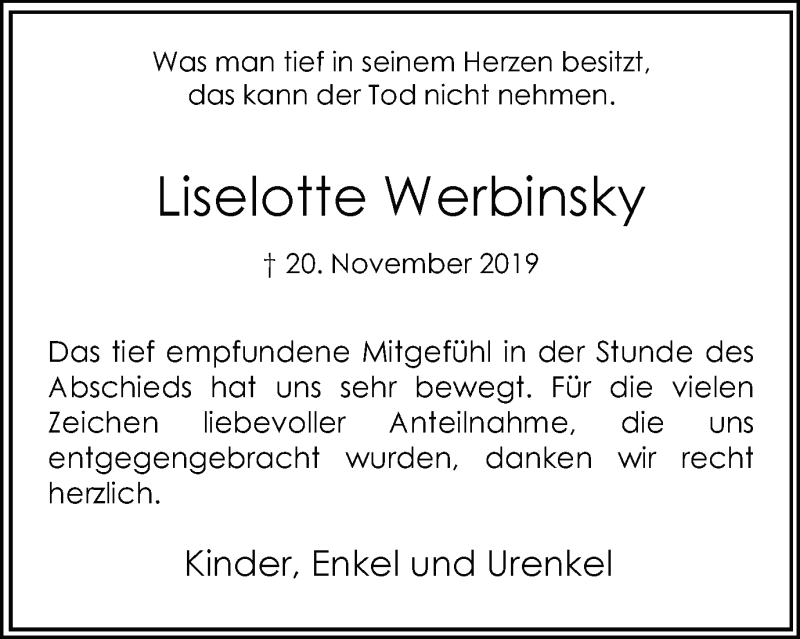 Hier finden Sie alle Traueranzeigen aus der Zeitung, die bisher für Liselotte Werbinsky erschienen sind. Weitere Traueranzeigen, die in der Zeitung erscheinen, werden hier ebenfalls aufgelistet