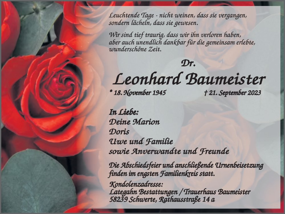 Hier finden Sie alle Traueranzeigen aus der Zeitung, die bisher für LLeonhard Baumeister erschienen sind. Weitere Traueranzeigen, die in der Zeitung erscheinen, werden hier ebenfalls aufgelistet