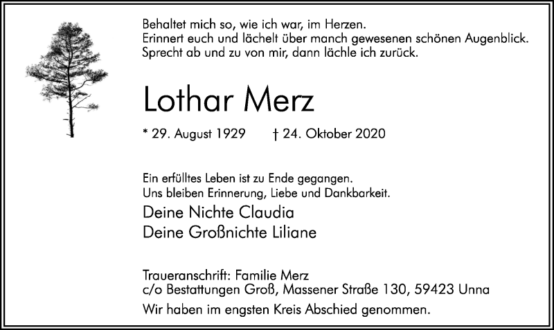 Hier finden Sie alle Traueranzeigen aus der Zeitung, die bisher für Lothar Merz erschienen sind. Weitere Traueranzeigen, die in der Zeitung erscheinen, werden hier ebenfalls aufgelistet