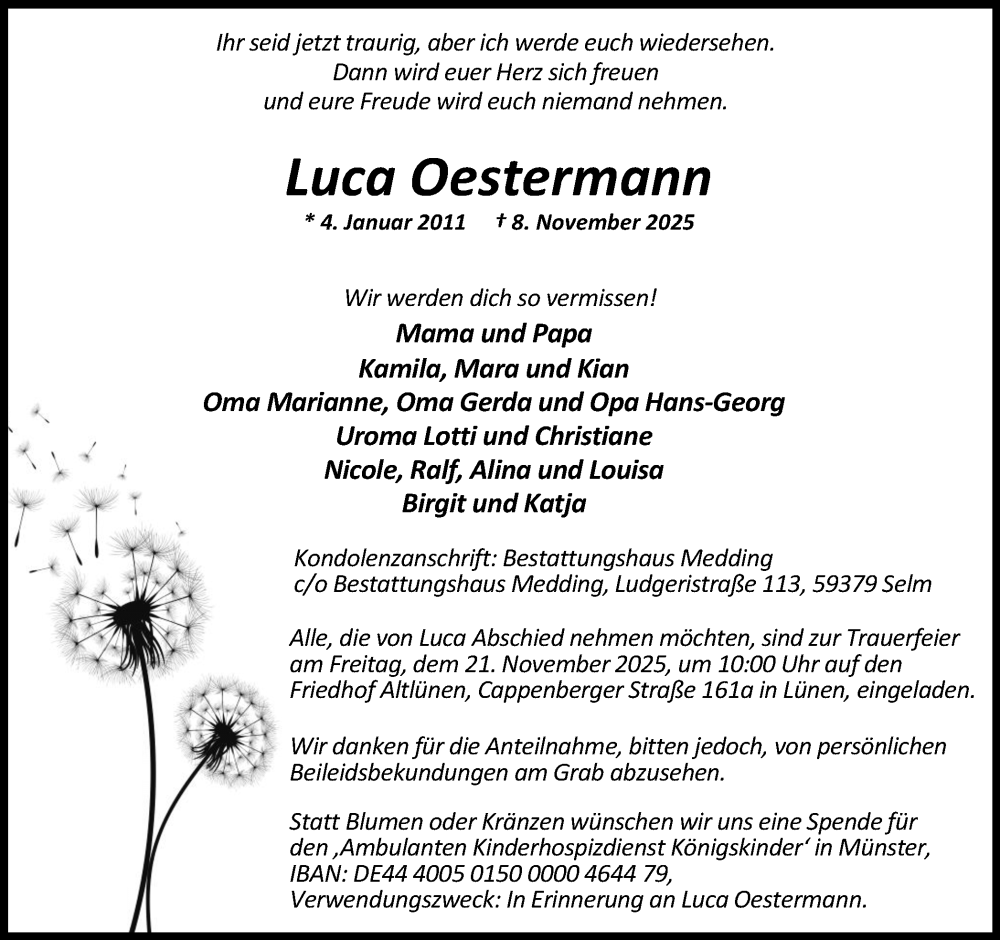 Hier finden Sie alle Traueranzeigen aus der Zeitung, die bisher für Luca Oestermann erschienen sind. Weitere Traueranzeigen, die in der Zeitung erscheinen, werden hier ebenfalls aufgelistet