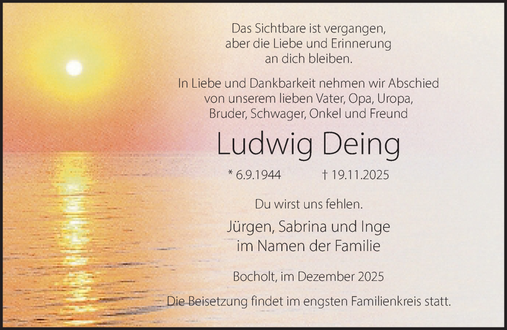 Hier finden Sie alle Traueranzeigen aus der Zeitung, die bisher für Ludwig Deing erschienen sind. Weitere Traueranzeigen, die in der Zeitung erscheinen, werden hier ebenfalls aufgelistet