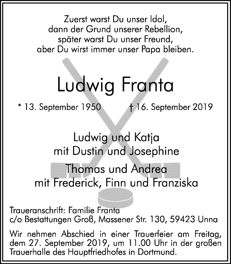 Hier finden Sie alle Traueranzeigen aus der Zeitung, die bisher für Ludwig Franta erschienen sind. Weitere Traueranzeigen, die in der Zeitung erscheinen, werden hier ebenfalls aufgelistet