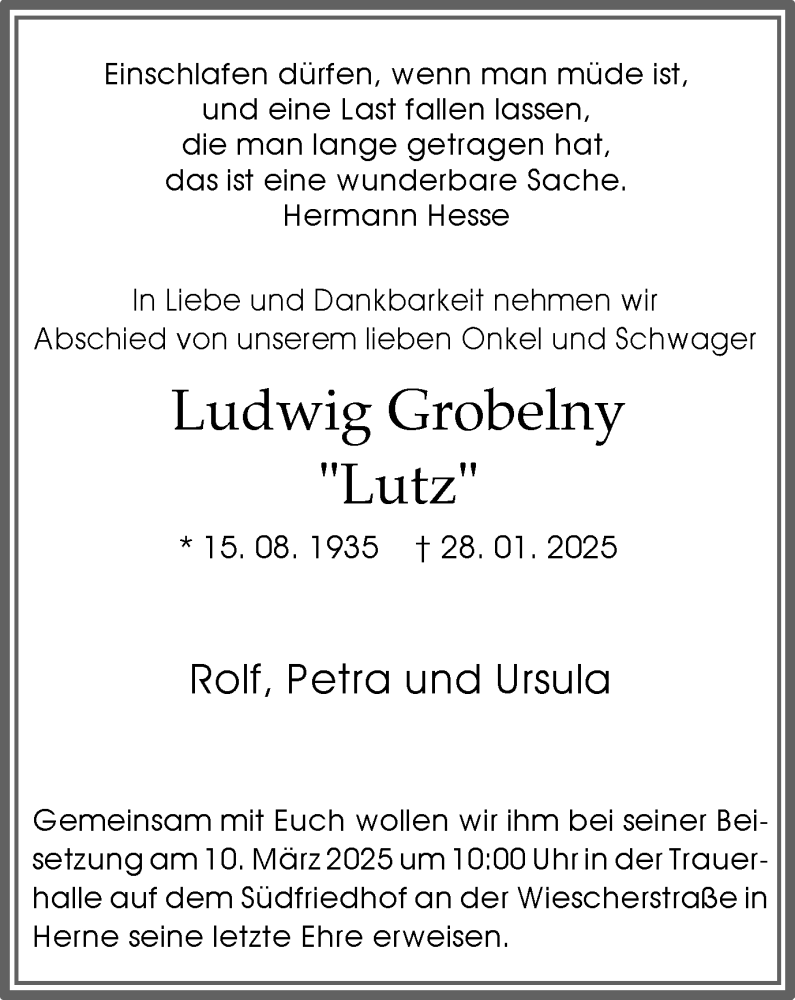 Hier finden Sie alle Traueranzeigen aus der Zeitung, die bisher für Ludwig Grobelny erschienen sind. Weitere Traueranzeigen, die in der Zeitung erscheinen, werden hier ebenfalls aufgelistet