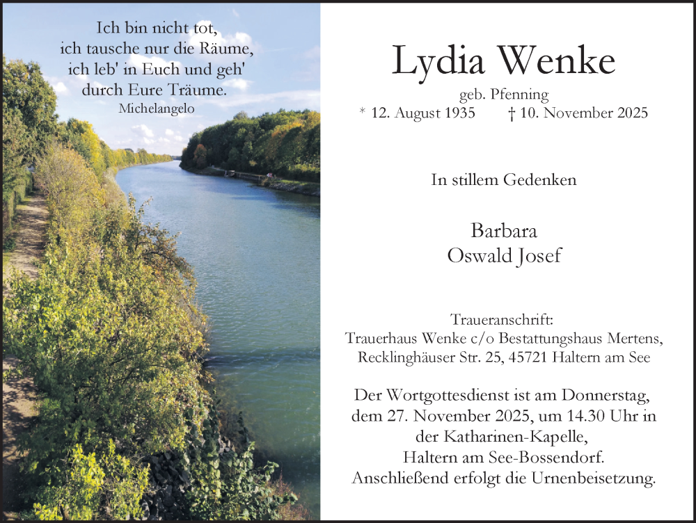 Hier finden Sie alle Traueranzeigen aus der Zeitung, die bisher für Lydia Wenke erschienen sind. Weitere Traueranzeigen, die in der Zeitung erscheinen, werden hier ebenfalls aufgelistet