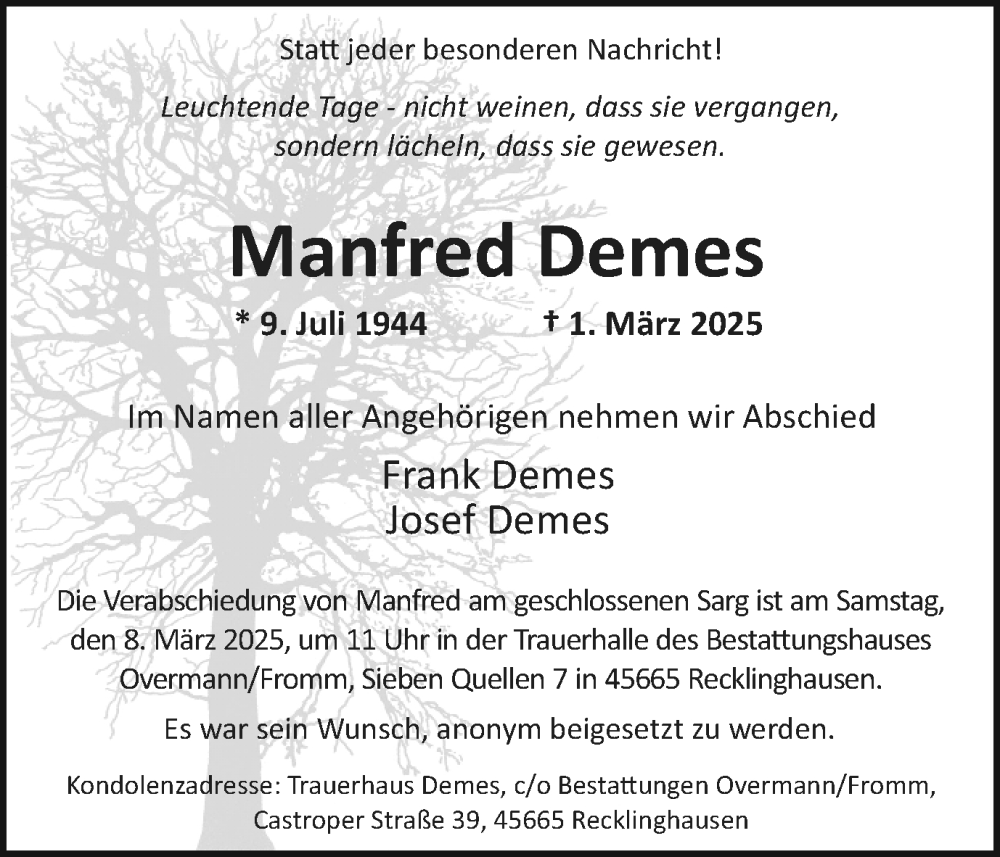 Hier finden Sie alle Traueranzeigen aus der Zeitung, die bisher für Manfred Demes erschienen sind. Weitere Traueranzeigen, die in der Zeitung erscheinen, werden hier ebenfalls aufgelistet