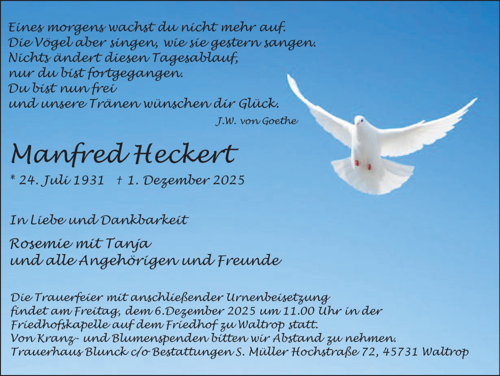 Hier finden Sie alle Traueranzeigen aus der Zeitung, die bisher für Manfred Heckert erschienen sind. Weitere Traueranzeigen, die in der Zeitung erscheinen, werden hier ebenfalls aufgelistet