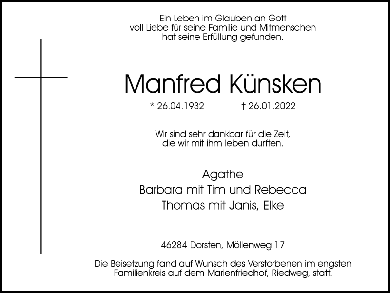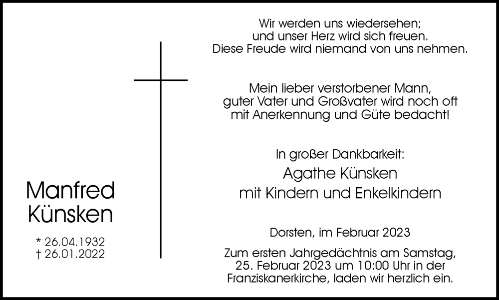 Hier finden Sie alle Traueranzeigen aus der Zeitung, die bisher für Manfred Künsken erschienen sind. Weitere Traueranzeigen, die in der Zeitung erscheinen, werden hier ebenfalls aufgelistet