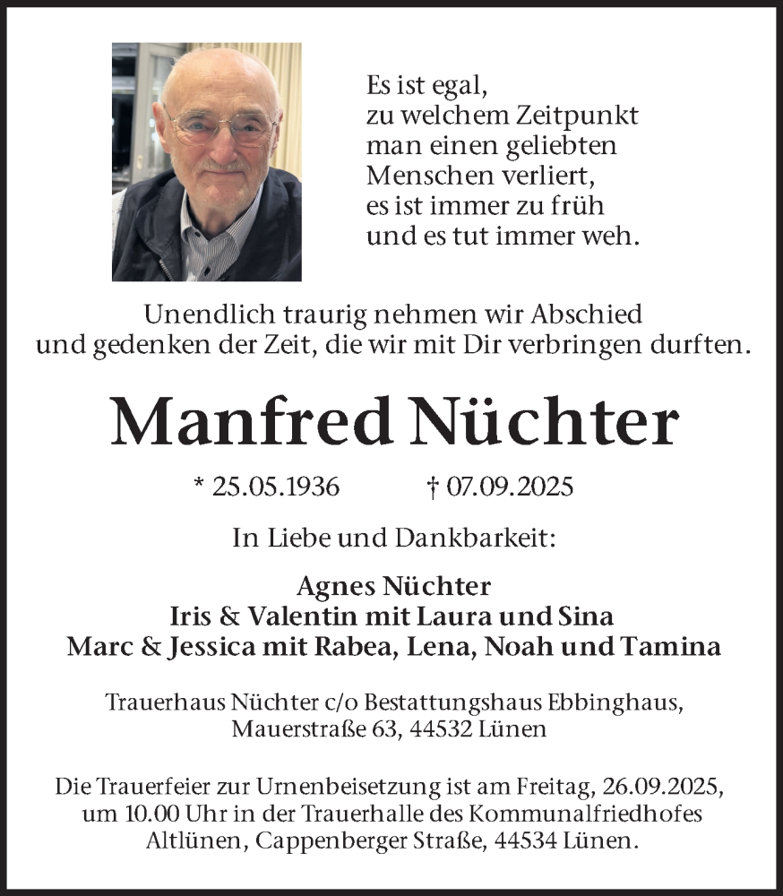 Hier finden Sie alle Traueranzeigen aus der Zeitung, die bisher für Manfred Nüchter erschienen sind. Weitere Traueranzeigen, die in der Zeitung erscheinen, werden hier ebenfalls aufgelistet
