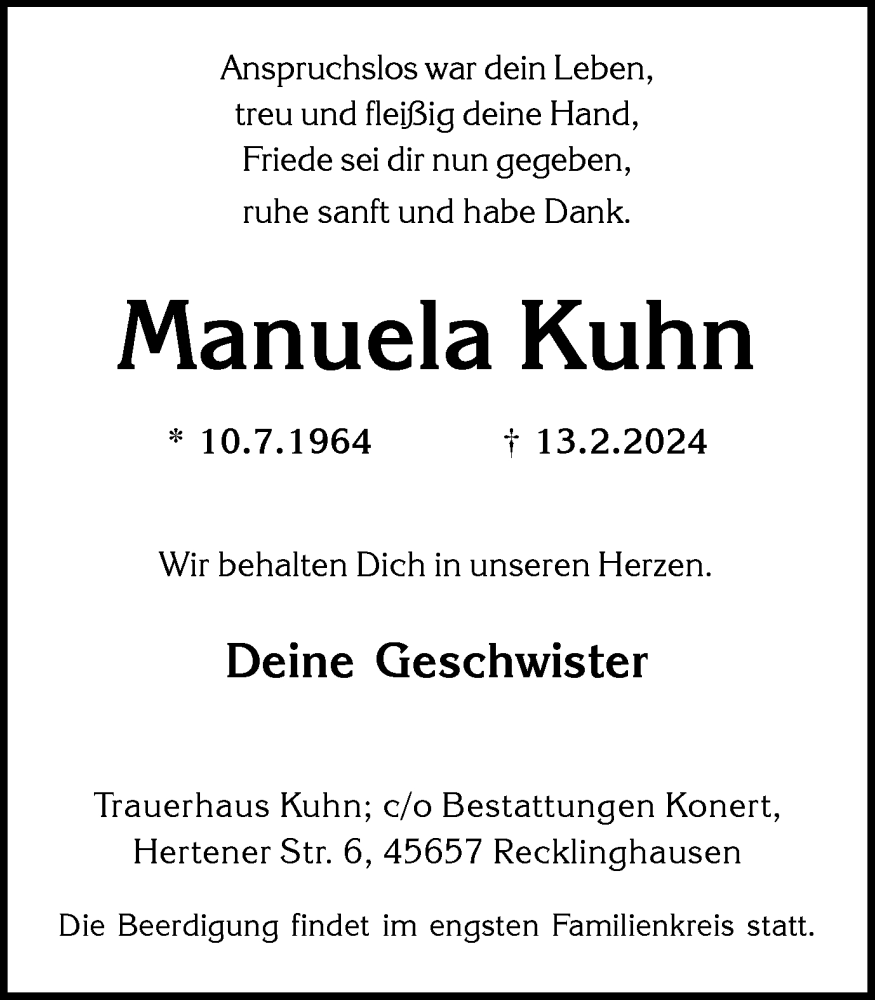 Hier finden Sie alle Traueranzeigen aus der Zeitung, die bisher für Manuela Kuhn erschienen sind. Weitere Traueranzeigen, die in der Zeitung erscheinen, werden hier ebenfalls aufgelistet