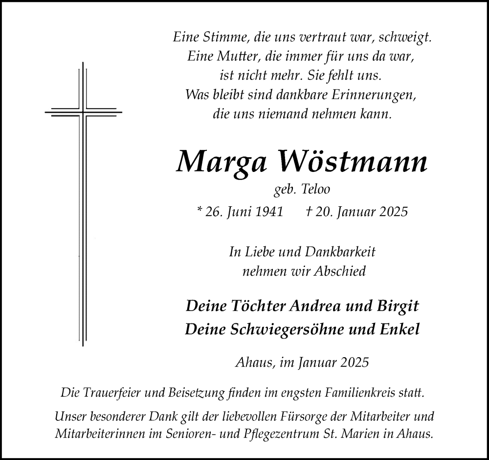 Hier finden Sie alle Traueranzeigen aus der Zeitung, die bisher für Marga Wöstmann erschienen sind. Weitere Traueranzeigen, die in der Zeitung erscheinen, werden hier ebenfalls aufgelistet