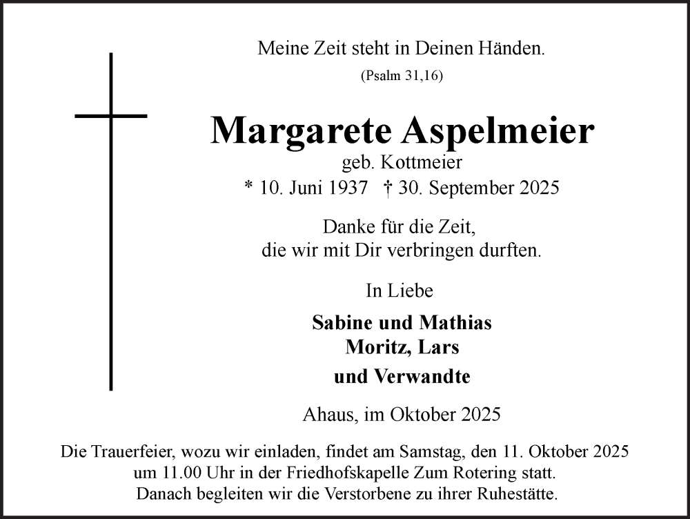 Hier finden Sie alle Traueranzeigen aus der Zeitung, die bisher für Margarete Aspelmeier erschienen sind. Weitere Traueranzeigen, die in der Zeitung erscheinen, werden hier ebenfalls aufgelistet
