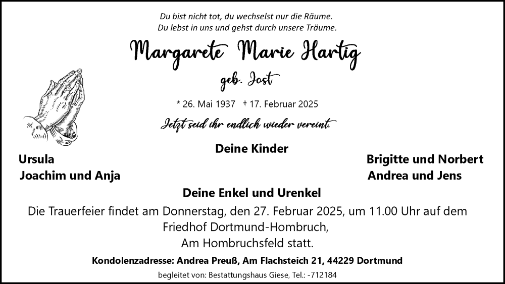 Hier finden Sie alle Traueranzeigen aus der Zeitung, die bisher für Margarete Marie Hartig erschienen sind. Weitere Traueranzeigen, die in der Zeitung erscheinen, werden hier ebenfalls aufgelistet