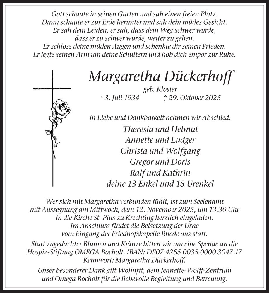 Hier finden Sie alle Traueranzeigen aus der Zeitung, die bisher für Margaretha Dückerhoff erschienen sind. Weitere Traueranzeigen, die in der Zeitung erscheinen, werden hier ebenfalls aufgelistet