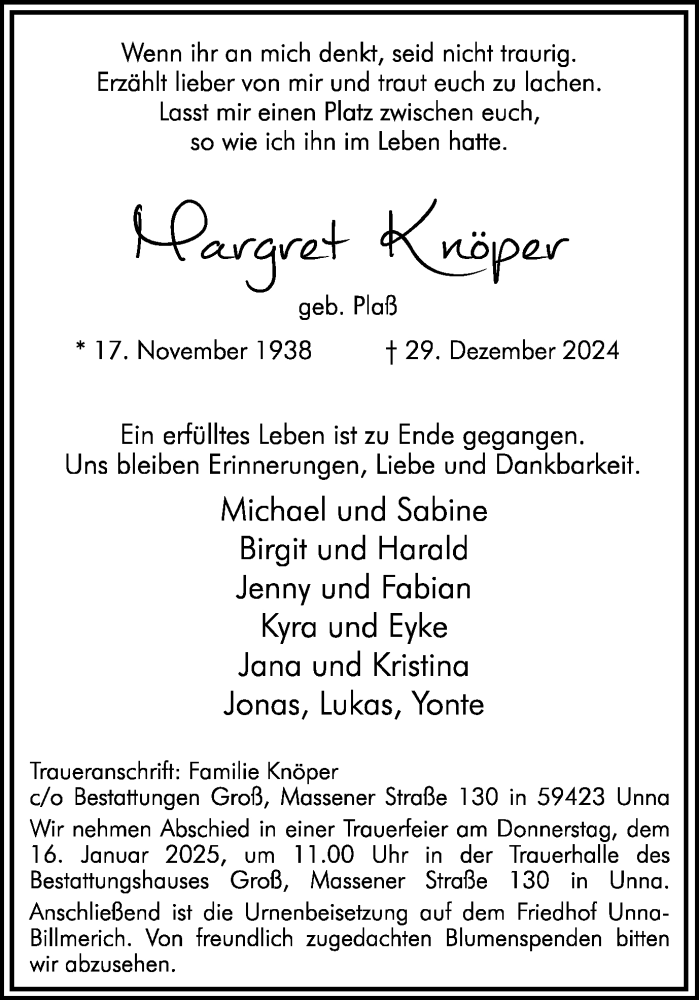 Hier finden Sie alle Traueranzeigen aus der Zeitung, die bisher für Margot Knöper erschienen sind. Weitere Traueranzeigen, die in der Zeitung erscheinen, werden hier ebenfalls aufgelistet