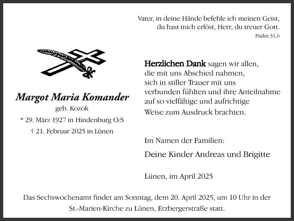 Hier finden Sie alle Traueranzeigen aus der Zeitung, die bisher für Margot Komander erschienen sind. Weitere Traueranzeigen, die in der Zeitung erscheinen, werden hier ebenfalls aufgelistet