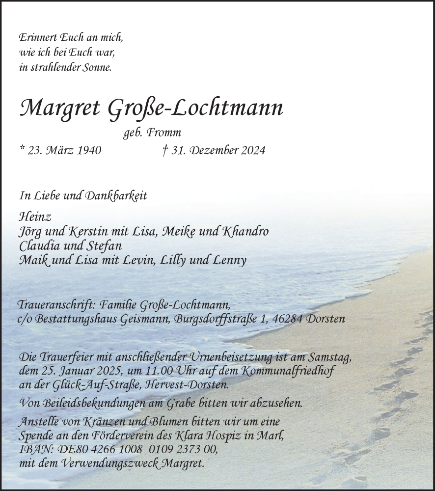 Hier finden Sie alle Traueranzeigen aus der Zeitung, die bisher für Margret Große-Lochtmann erschienen sind. Weitere Traueranzeigen, die in der Zeitung erscheinen, werden hier ebenfalls aufgelistet