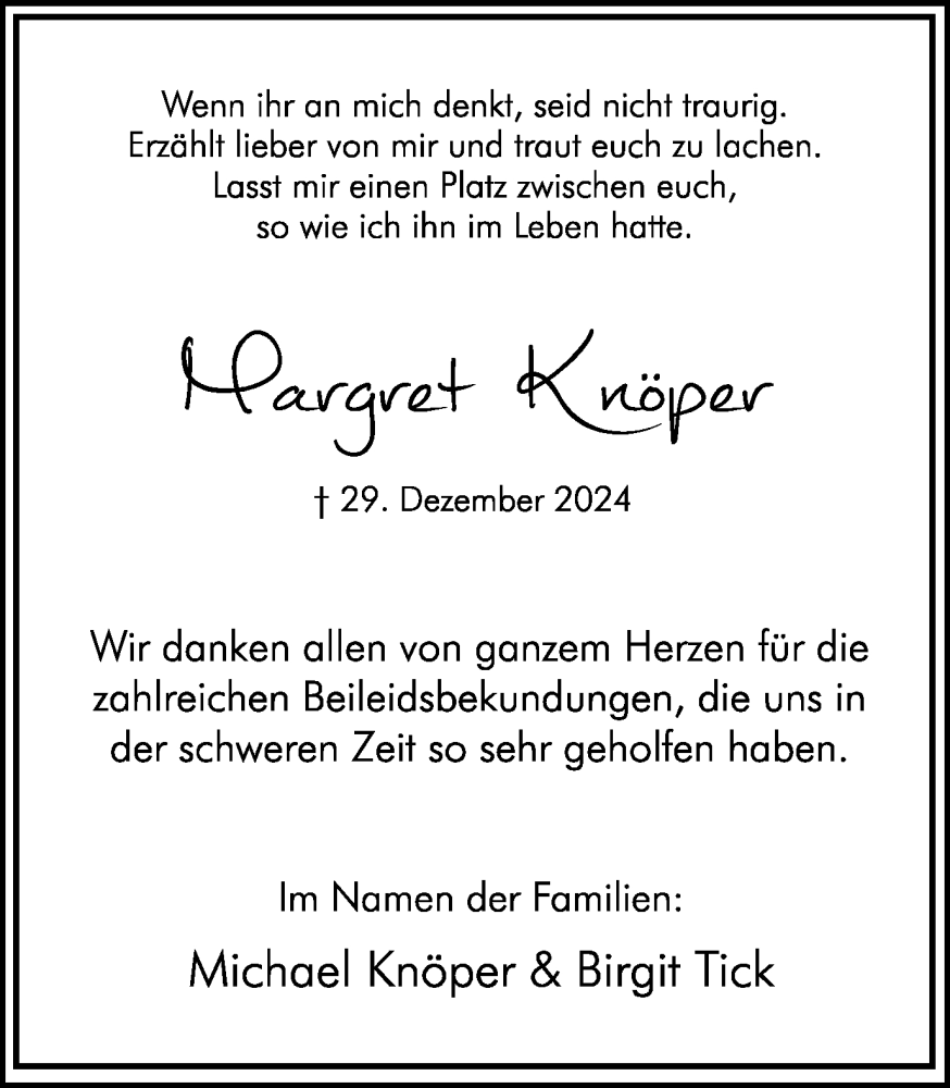 Hier finden Sie alle Traueranzeigen aus der Zeitung, die bisher für Margret Knöper erschienen sind. Weitere Traueranzeigen, die in der Zeitung erscheinen, werden hier ebenfalls aufgelistet