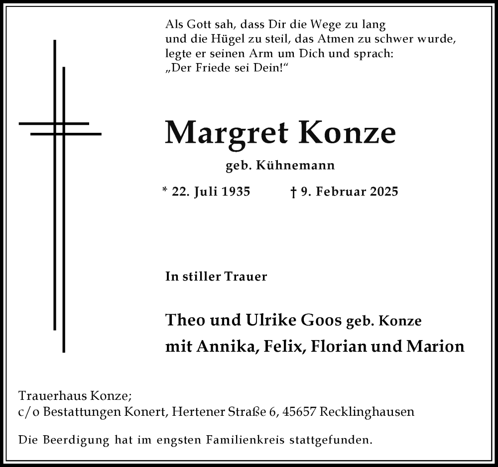 Hier finden Sie alle Traueranzeigen aus der Zeitung, die bisher für Margret Konze erschienen sind. Weitere Traueranzeigen, die in der Zeitung erscheinen, werden hier ebenfalls aufgelistet