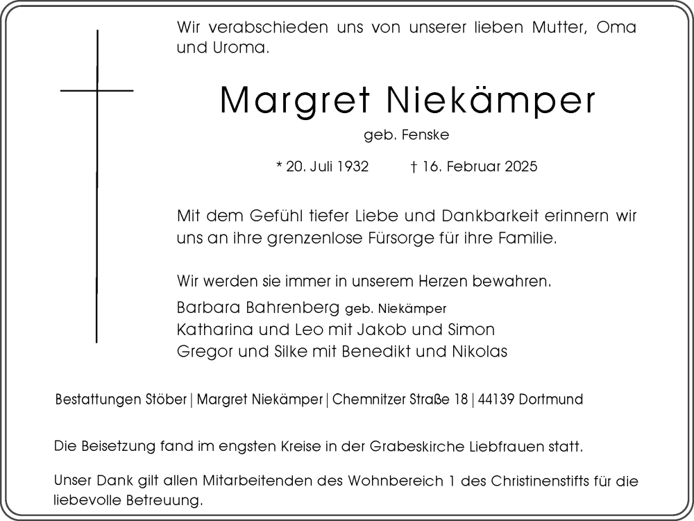 Hier finden Sie alle Traueranzeigen aus der Zeitung, die bisher für Margret Niekämper erschienen sind. Weitere Traueranzeigen, die in der Zeitung erscheinen, werden hier ebenfalls aufgelistet