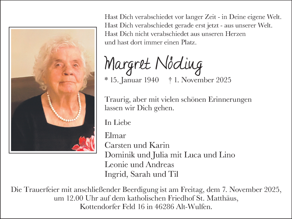 Hier finden Sie alle Traueranzeigen aus der Zeitung, die bisher für Margret Nöding erschienen sind. Weitere Traueranzeigen, die in der Zeitung erscheinen, werden hier ebenfalls aufgelistet