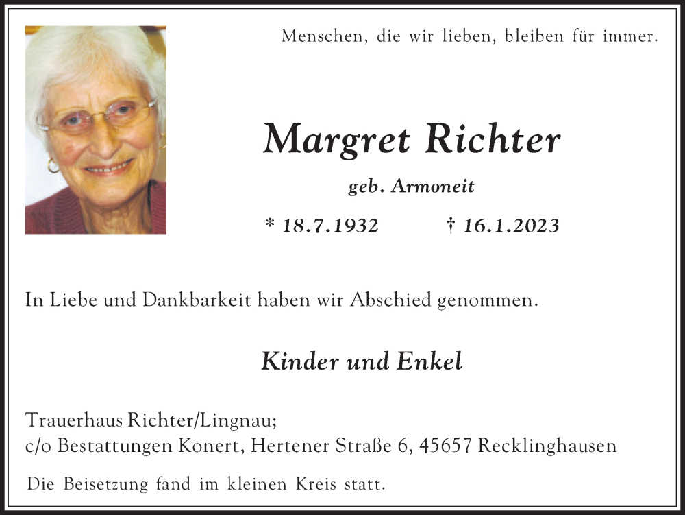 Hier finden Sie alle Traueranzeigen aus der Zeitung, die bisher für Margret Richter erschienen sind. Weitere Traueranzeigen, die in der Zeitung erscheinen, werden hier ebenfalls aufgelistet