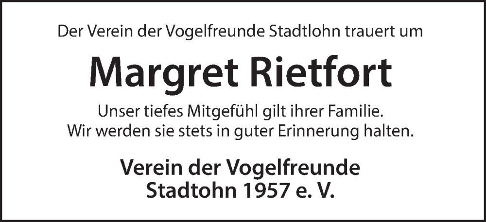 Hier finden Sie alle Traueranzeigen aus der Zeitung, die bisher für Margret Rietfort erschienen sind. Weitere Traueranzeigen, die in der Zeitung erscheinen, werden hier ebenfalls aufgelistet