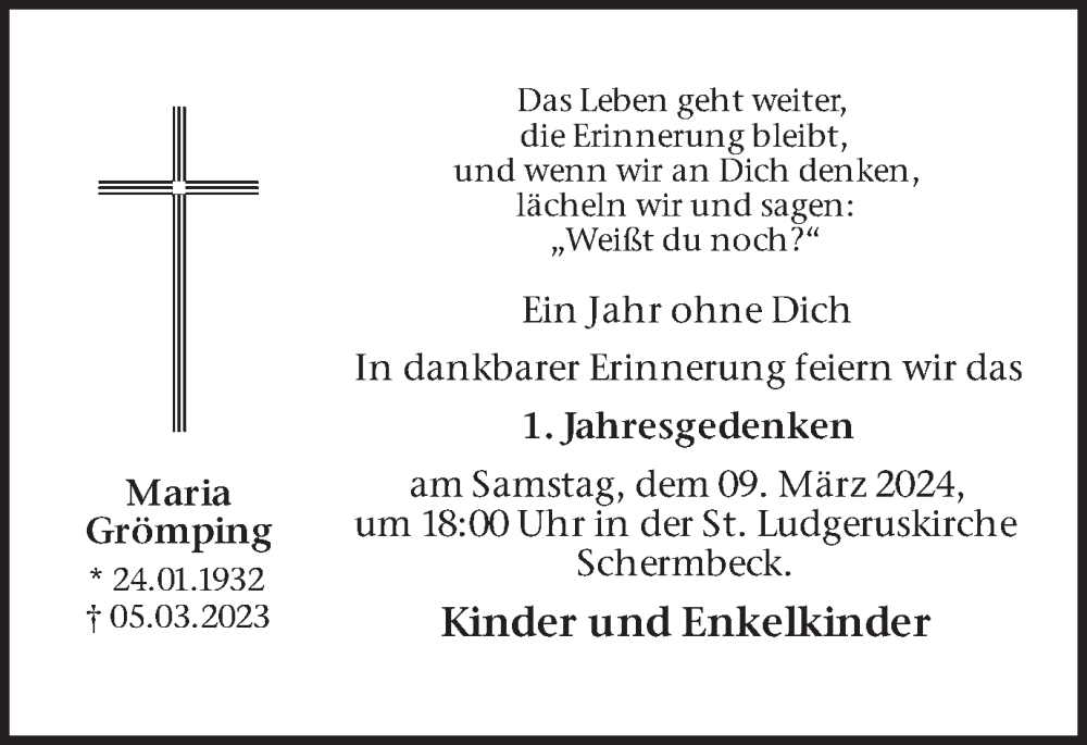 Hier finden Sie alle Traueranzeigen aus der Zeitung, die bisher für Maria Grömping erschienen sind. Weitere Traueranzeigen, die in der Zeitung erscheinen, werden hier ebenfalls aufgelistet