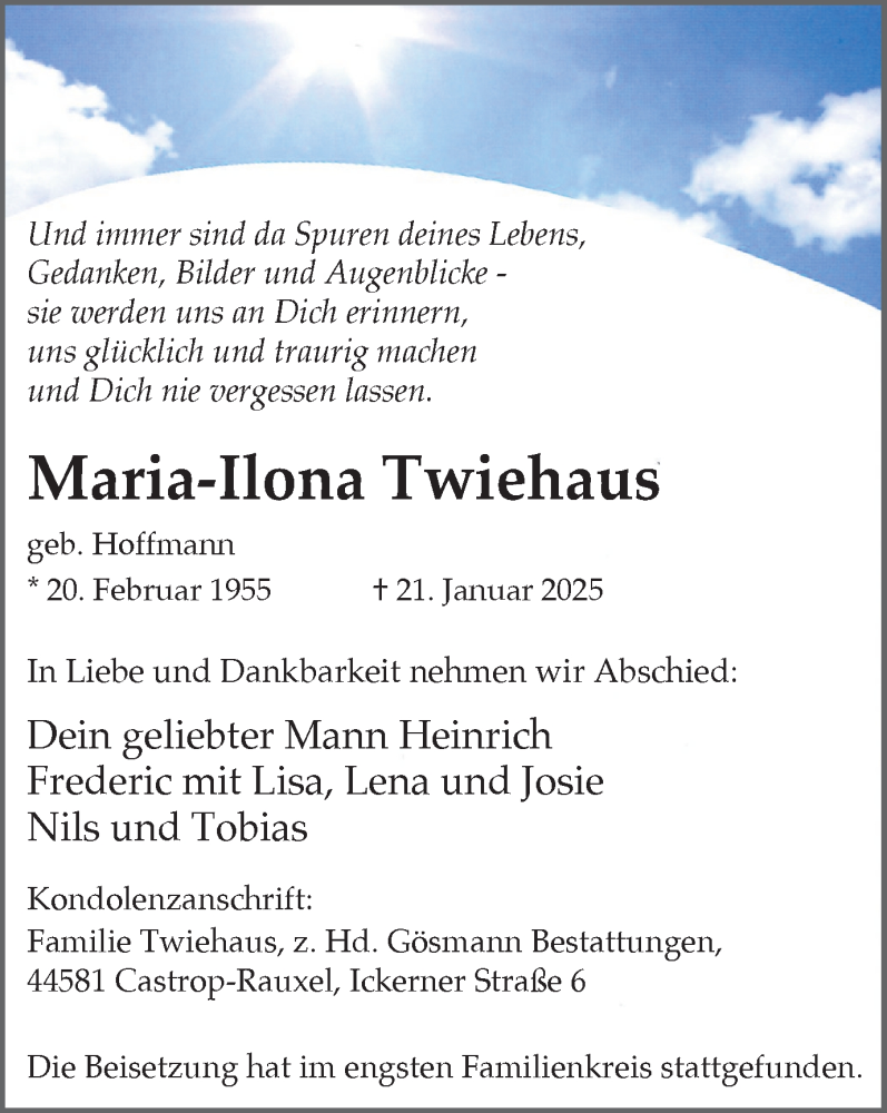 Hier finden Sie alle Traueranzeigen aus der Zeitung, die bisher für Maria-Ilona Twiehaus erschienen sind. Weitere Traueranzeigen, die in der Zeitung erscheinen, werden hier ebenfalls aufgelistet