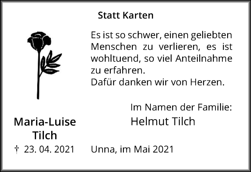 Hier finden Sie alle Traueranzeigen aus der Zeitung, die bisher für Maria-Luise Tilch erschienen sind. Weitere Traueranzeigen, die in der Zeitung erscheinen, werden hier ebenfalls aufgelistet