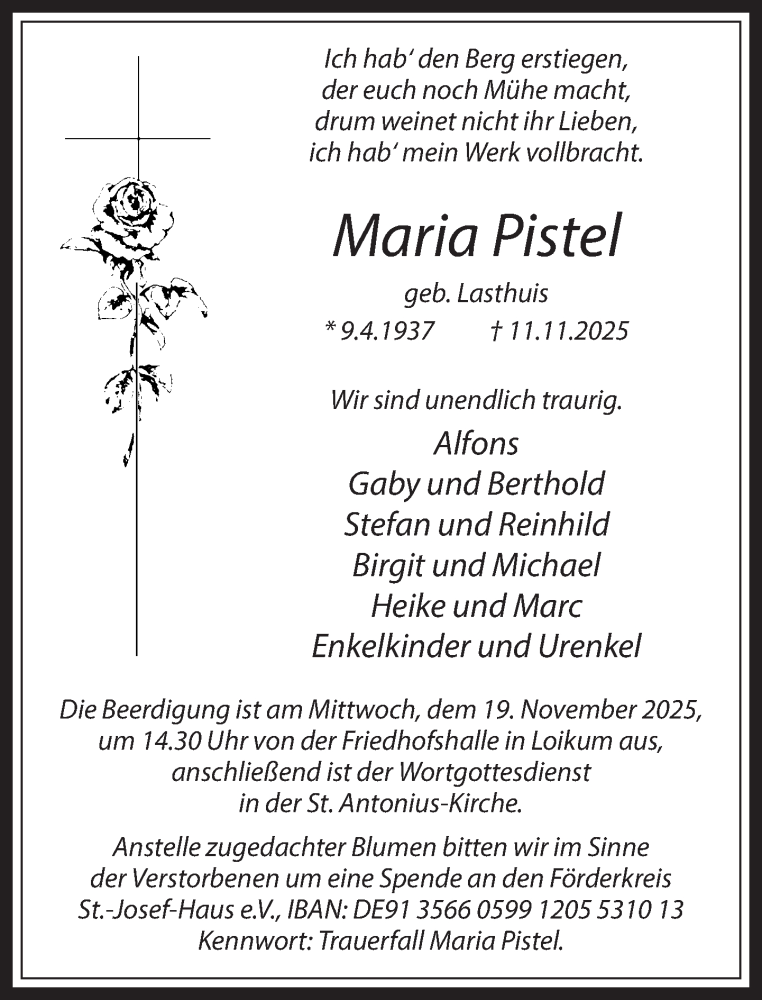 Hier finden Sie alle Traueranzeigen aus der Zeitung, die bisher für Maria Pistel erschienen sind. Weitere Traueranzeigen, die in der Zeitung erscheinen, werden hier ebenfalls aufgelistet