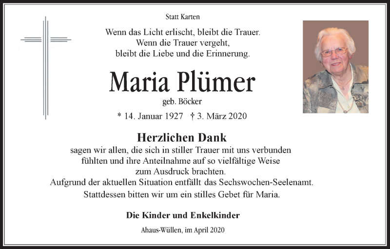 Hier finden Sie alle Traueranzeigen aus der Zeitung, die bisher für Maria Plümer erschienen sind. Weitere Traueranzeigen, die in der Zeitung erscheinen, werden hier ebenfalls aufgelistet