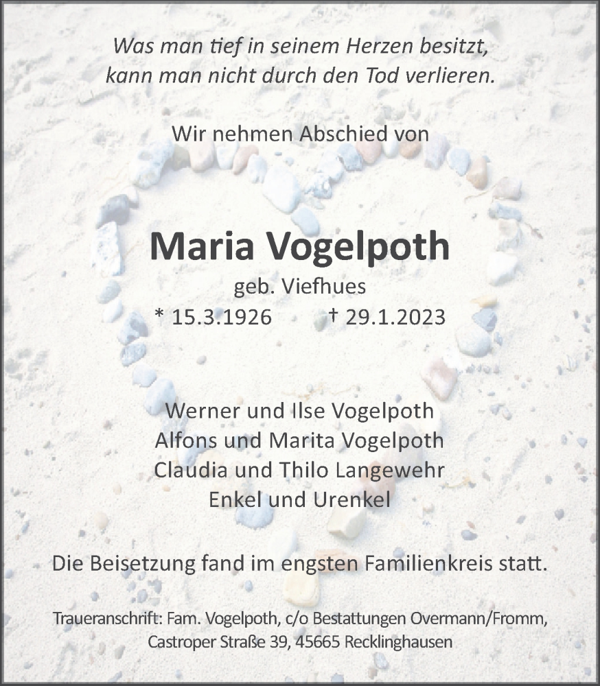 Hier finden Sie alle Traueranzeigen aus der Zeitung, die bisher für Maria Vogelpoth erschienen sind. Weitere Traueranzeigen, die in der Zeitung erscheinen, werden hier ebenfalls aufgelistet