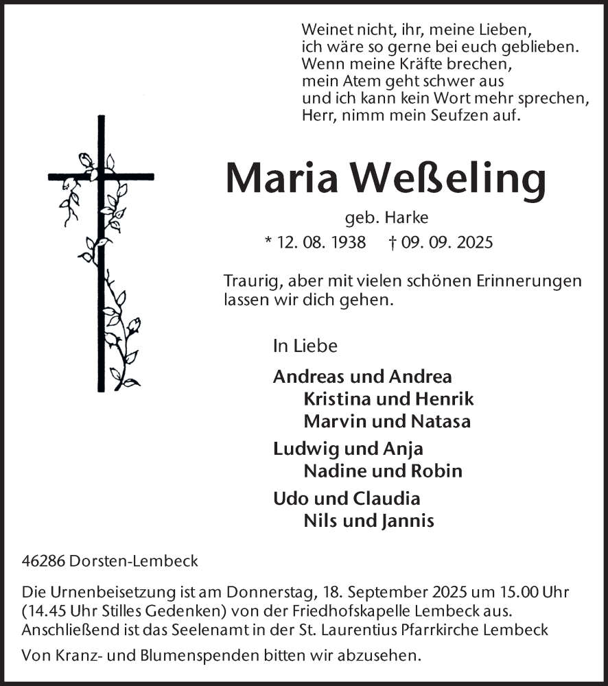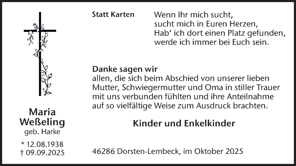 Hier finden Sie alle Traueranzeigen aus der Zeitung, die bisher für Maria Weßeling erschienen sind. Weitere Traueranzeigen, die in der Zeitung erscheinen, werden hier ebenfalls aufgelistet
