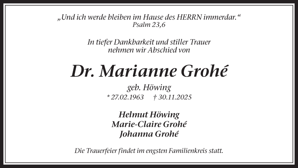 Hier finden Sie alle Traueranzeigen aus der Zeitung, die bisher für Marianne Grohe erschienen sind. Weitere Traueranzeigen, die in der Zeitung erscheinen, werden hier ebenfalls aufgelistet