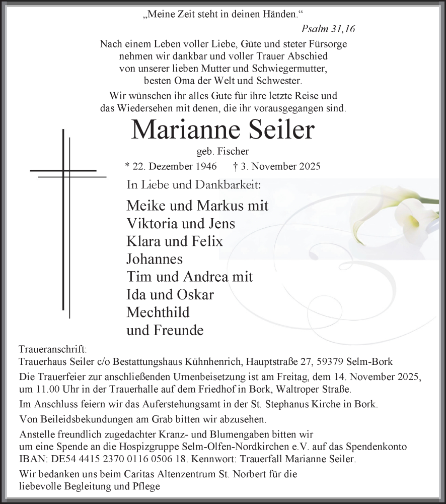Hier finden Sie alle Traueranzeigen aus der Zeitung, die bisher für Marianne Seiler erschienen sind. Weitere Traueranzeigen, die in der Zeitung erscheinen, werden hier ebenfalls aufgelistet