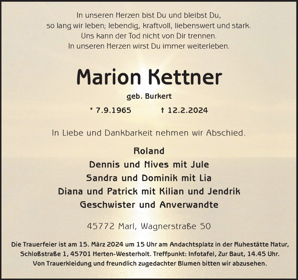 Hier finden Sie alle Traueranzeigen aus der Zeitung, die bisher für Marion Kettner erschienen sind. Weitere Traueranzeigen, die in der Zeitung erscheinen, werden hier ebenfalls aufgelistet