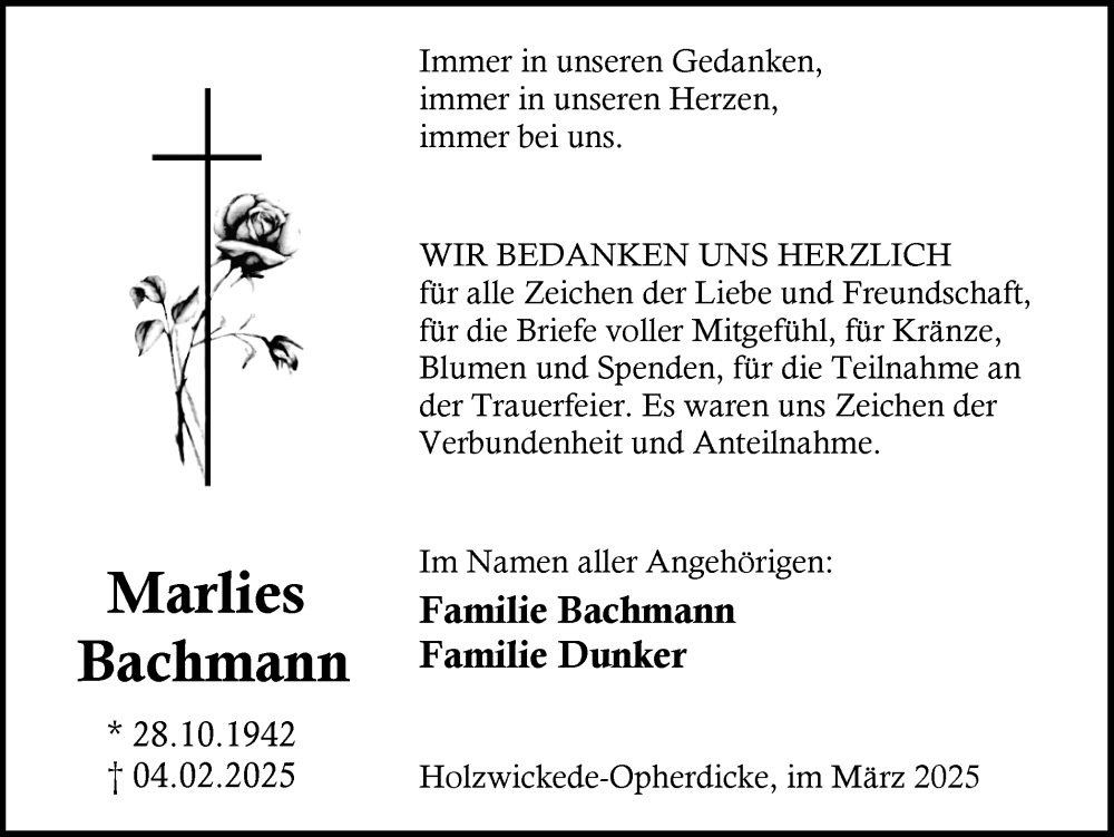 Hier finden Sie alle Traueranzeigen aus der Zeitung, die bisher für Marlies Bachmann erschienen sind. Weitere Traueranzeigen, die in der Zeitung erscheinen, werden hier ebenfalls aufgelistet