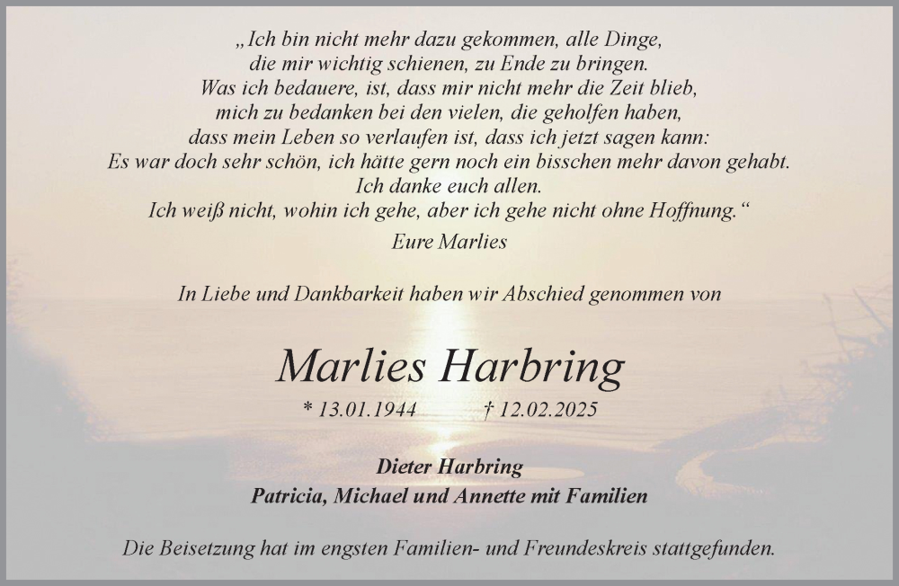 Hier finden Sie alle Traueranzeigen aus der Zeitung, die bisher für Marlies Harbring erschienen sind. Weitere Traueranzeigen, die in der Zeitung erscheinen, werden hier ebenfalls aufgelistet