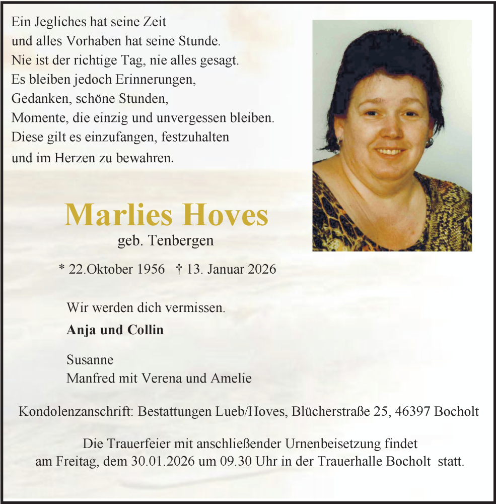 Hier finden Sie alle Traueranzeigen aus der Zeitung, die bisher für Marlies Hoves erschienen sind. Weitere Traueranzeigen, die in der Zeitung erscheinen, werden hier ebenfalls aufgelistet