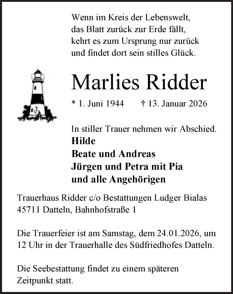 Hier finden Sie alle Traueranzeigen aus der Zeitung, die bisher für Marlies Ridder erschienen sind. Weitere Traueranzeigen, die in der Zeitung erscheinen, werden hier ebenfalls aufgelistet
