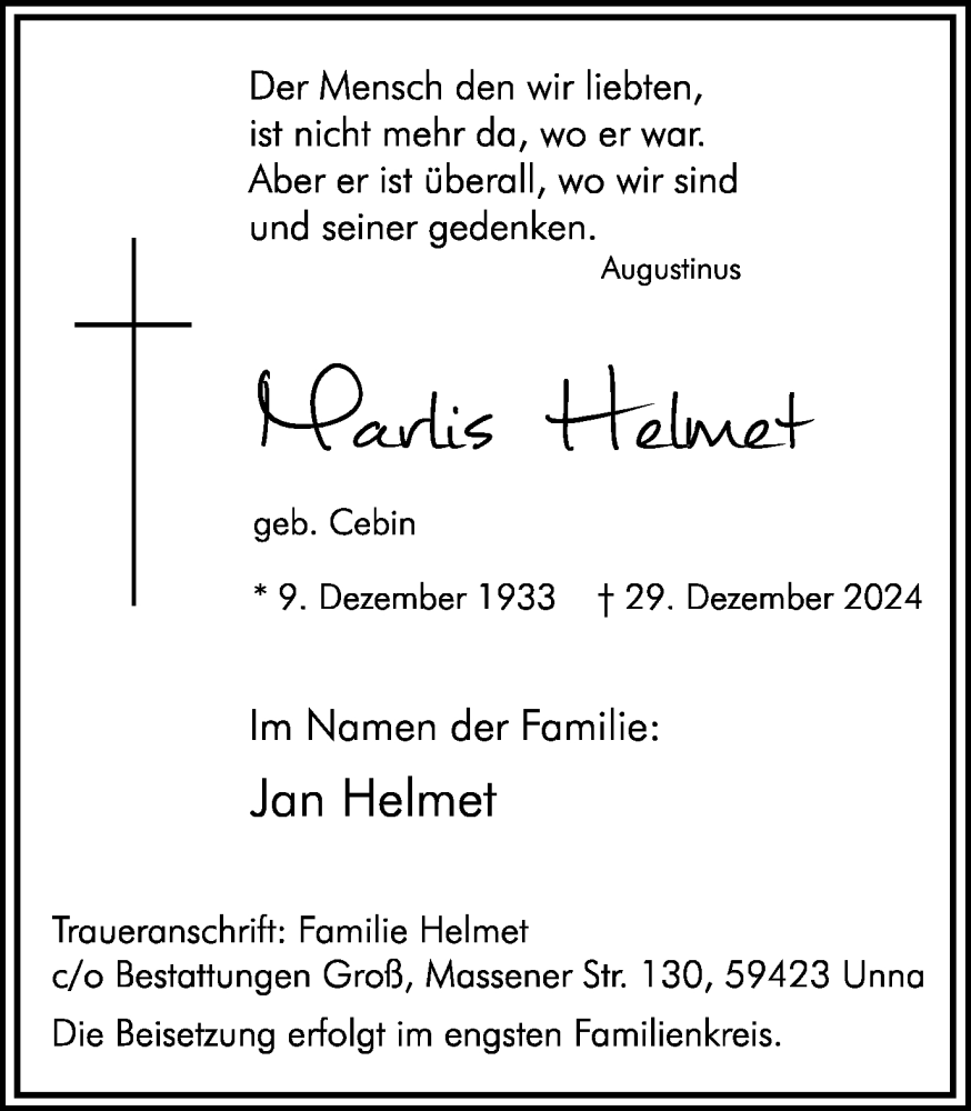Hier finden Sie alle Traueranzeigen aus der Zeitung, die bisher für Marlis Helmet erschienen sind. Weitere Traueranzeigen, die in der Zeitung erscheinen, werden hier ebenfalls aufgelistet